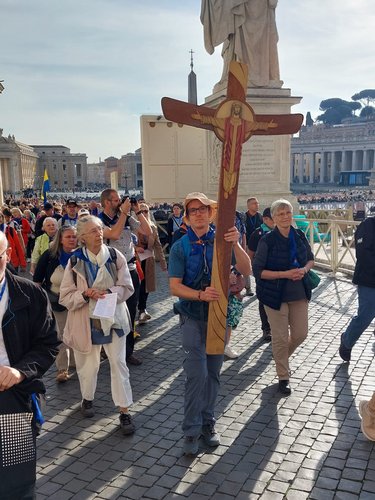 Der Morgen des zweiten Tages startete mit einem beeindruckenden und bewegenden Pilgerweg von der Engelsburg über die Via de la Conciliazione, über den Petersplatz in die Peterskirche. Gemeinsam beteten wir, verbunden über die Kopfhörer, vorne weg abwechselnd Pilgerinnen und Pilger, die ein Holzkreuz trugen und die Gruppe leiteten. Das Tragen des Kreuzes löste tiefe Berührung aus. Der Weg führte vom Obelisken auf dem Petersplatz hinein in den Petersdom durch die Heilige Pforte. Angekommen im Petersdom feierte die Reisegruppe einen Gottesdienst. Ein erhabenes Gefühl machte sich breit, in diesem denkwürdigen Dom, gemeinsam eine Messe zu feiern.