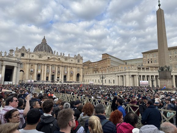 Ein wahrlich aufregender Tag liegt hinter uns oder mit anderen Worten: Dieser Tag war der Höhepunkt unserer Wallfahrt. Bereits um 6.45 Uhr ging es mit den Bussen von unseren Hotels aus los Richtung Petersplatz, denn heute stand die Generalaudienz mit Papst Leo XIV. auf dem Tagesprogramm. Neben den 357 Pilgerinnen und Pilgern aus Speyer wurden weitere 60.000 – 80.000 Gläubige erwartet. Eine unbeschreibliche Zahl, die in den vollen Straßen Roms spürbar war. Das Ziel war es natürlich: Papst Leo so nahe wie möglich zu kommen und eins oder auch zwei, oder vielleicht auch mehrere Fotos als Erinnerung mitnehmen zu können. Als wir auf dem Petersplatz ankamen, hieß es erstmal durchatmen: Die erste Hürde war geschafft. Und mit Blick auf die Uhr war auch gar nicht mehr viel Zeit, um einen guten Stehplatz zu ergattern. Kurz vor 10.00 Uhr erblickten wir ihn dann, wie er mit seinem Papamobil durch die abgesperrten Wege bis zum Petersdom fuhr. Ein wirklich besonderer Moment! Aufregung macht sich in der Gruppe breit, es wurde gejubelt und gerufen!
