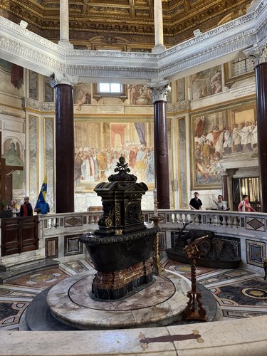Nach so vielen Eindrücken, kommt die Mittagspause gerade recht, die, wir sind in Rom, wie soll es also anders sein, mit Pizza essen verbracht wurde. Im Anschluss geht es weiter, zur Basilika Santa Maria Maggiore. Bei der Ankunft wird klar, was zu dieser Wallfahrt auch gehört ist, das Anstehen und Abwarten. Doch das trübt die Stimmung in der Gruppe nicht. Beim Warten wird geplaudert und gebetet, sich ausgetauscht oder sinniert. In der Zwischenzeit gesellte sich auch Bischof Wiesemann zur Gruppe, der via Kopfhörer der Pilgergruppe beim Durchschreiten der Heiligen Pforte on Santa Maria Maggiore einige besinnliche Gedanken mitgab. Wer die Kirche erkunden wollte, konnte dies gemeinsam mit einer Touristenführerin machen. Und dann hieß es nochmal anstehen, um einen besonderen Moment vor dem Grab von Papst Franziskus zu erhaschen und für ihn zu beten.